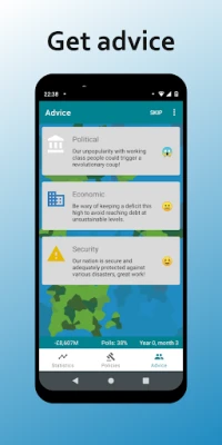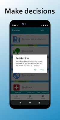 •  Policies: Set and implement policies in areas like education, health, and welfare. Each decision has far-reaching consequences, demonstrating the complexities of a true politics game.